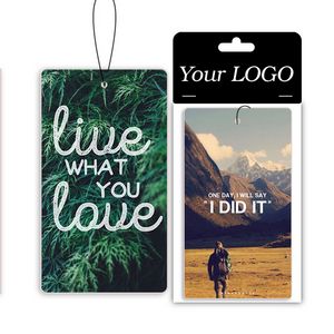 Keep your car smelling fresh, while promoting your school, cause, business or brand with these classically-styled hanging air fresheners. These fully-customizable cotton paper air fresheners can be created up to 13 square inches in size in almost any shape or color. Choose from dozens of scent options. Each unit comes individually cellophane bagged with a header card and elastic hanging strap. 12″ L