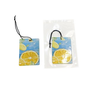 Promote your brand with this Custom Cotton Paper Double Sided Car Air Freshener. Made from eco friendly cotton paper, it offers customizable shapes, sizes, and vibrant double sided printing. Infused with captivating scents like gardenia, osmanthus, and lemon, it ensures a refreshing ambiance. Complete with an elastic hanging loop for effortless display, it is ideal for car dealerships, car washes, and travel promotions. A cost effective, practical tool to boost brand visibility. 2.7″ L x 2.7″ L