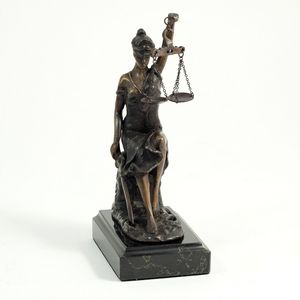 Bronze seated lady justice sculpture on marble base. 8″ H x 4.25″ W x 2.75″ D