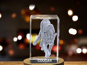 Give the gift of wild feline majesty with this stunning 3D engraved crystal featuring an artistic rendering of a majestic cougar. The sculpture elegantly captures the stealth, power and predatory grace of this iconic mountain cat in a tangible yet elegant form that will thrill any wildlife enthusiast. This uniquely designed piece honors our appreciation for fierce yet graceful creatures through a stylized motif of a stealthy cougar engraved in timeless crystal. 3″ L x 2″ W x 2″ Diameter