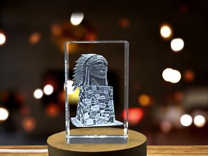 This admirable piece of American history with an engraved crystal rendition of an Indian icon. Everything from the elaborate headdress to the stoic expression is carved with intricate detail. A thoughtful gift that preserves the legacy of this iconic sculpture.How it’s made: First, our designers create a unique and detailed 3D model. Then, our skilled technicians etch the 3D model into crystal using advanced laser technology.Includes FREE Round LED Base Light (plug-in)Packaged in a thoughtfully prepared keepsake gift box with a black silk inlay. 3″ L x 2″ W x 2″ Diameter